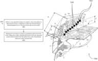 FIG.43 is a perspective fragmentary view of the anatomy within the anterior chamber of an eye depicting the comeoscleral angle similar toFIG.2, with locations of shots applied to the trabecular meshwork depicted with x's and shown forming a transverse line. As described herein, an ELT procedure is performed by perforating thetrabecular meshwork9,13 of an eye. This permits fluid in aflow1 to pass through thetrabecular meshwork9,13 and into Schlemm'scanal11, thereby reducing the intraocular pressure in the eye. As shown, thetrabecular meshwork9,13 may have a height of a distance A, while the Schlemm'scanal11, which is concealed to an ELT operator beneath thetrabecular meshwork9,13, may have a height of B. Because an operator may not be able to see the Schlemm'scanal11 under thetrabecular meshwork9,13, an operator may miss the Schlemm's canal with one or more shots and an ELT procedure can fail or be less effective. If an operator applied shots in a straight line, every shot has the potential to miss the Schlemm's canal, therefore potentially causing a failed procedure.