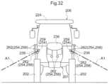 As shown inFIGS.29 and35, thesecond cover295 is constituted by a first recessedportion231A that is formed at a right/left intermediate portion of the rear end portion of therear cover231 of theroof224, and a second recessedportion232A that is formed at a right/left intermediate portion of the rear end portion of theouter roof232 of theroof224. In other words, the rear end portion of therear cover231 and the rear end portion of theouter roof232 are also used as constituent components of thesecond cover295.