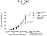 The results of the study shown as tumor volume plotted as a function of time (post tumor implantation) are provided inFIGS.24A-24C. As shown inFIG.24A, mice that were treated with anti-PD-1 antibody and with TIGIT and CD112R genes knocked out, thereby providing a triple blockade of all three targets, exhibited the highest extent of tumor growth inhibition (TGI). Blockade of TIGIT (via gene KO) and blockade of PD-1 through antibody treatment provided a 60% TGI. Similar results were seen in TIGIT/CD112R double knock-out B16F10 mice treated with anti-PD-1 antibody. Triple blockade led to the greatest amount of TGI. As shown inFIG.24C, triple blockade with anti-TIGIT mAb/antiCD112R mAb combination formulation plus anti-PD-1 mAb (purple) led to the largest decrease in tumor volume relative to tumor volume of isotype control treated mice (black). These results support that CD112R+TIGIT+PD-1 triple blockade inhibits tumor growth better than double combination or single blockade. The data ofFIGS.24A-24C support that triple blockade led to the most robust inhibition of tumor growth compared to groups treated with PD-1 mAb alone, or the TIGIT+CD112R combination. These results support that TIGIT+CD112R+PD-1 triple blockade is efficacious in inhibiting tumor growth in vivo.