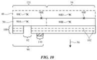 FIG.10 shows illustrative fiducial and infrared reflector arrangements that may be used fordevice10. As shown inFIG.10,waveguide50 may have a first portion (e.g., in region121) that is not overlapped byoutput coupler52 and a second portion that is overlapped byoutput coupler52.Output coupler52 may be formed from a diffraction grating (e.g., a surface grating, a hologram formed in or onlayer50, etc.), and/or other structures for coupling guided image light out ofwaveguide50 indirection56.Layer100 may be formed on the surface of waveguide50 (as an example) and may be formed frompatterned layers102 and/or from grating structures of the type shown inFIG.8.Optional coating110 may be formed onlayer100 and/or directly onwaveguide50. The patterns used for formingcoating110 and/orlayer100 may be used to form one or more fiducials. If desired,layer100 and/orcoating110 may be formed on a lens such as lens46 (e.g., a lens formed partly usingwaveguide50 or a transparent substrate that is separate from waveguide50) in addition to or instead of onwaveguide50.Fiducials90 may, in general, be formed so as to overlap the outline of infrared-light reflector,output coupler52, the portion ofwaveguide50 withoutoutput coupler52, and/or to overlap portions oflens46 without overlapping eitherwaveguide50 oroutput coupler52.Lens46 may be formed by one or more transparent structures (e.g., one or more transparent glass and/or polymer layers) and may or may not have an associated lens power.Lens46 may be used to help support waveguide and may be separate fromwaveguide50 and/or portions ofwaveguide50 may be integrated intolens46 and/or may formlens46.