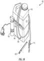 Moreover, it should be further appreciated that thepump108 may be a manually operated pump (i.e., hand pump) or an electrically operatedpump108 in which case thepump108 may include a and/or electronics/power cord to connect to an external power source (such as a wall plug). It is contemplated that in other embodiments, a battery may be used to power the pump. Furthermore, it is contemplated that thefirst container104 and/or thesecond container106 of thecleaning device100 may be any size desired, suitable to the desired end purpose. For example, in the embodiment shown inFIG.1A, thecleaning device100 is configured to have afirst container cavity120 of one (1)-five (5) gallons and thus may be carried (either by hand or via backpack configuration) by the user. Moreover, in still yet another embodiment and referring toFIG.1B, acleaning device160 having afirst container162, asecond container164, apump166, a dispensinghose168, atrigger valve170 and a dispensingnozzle172 is shown, wherein thefirst container162 defines a first container cavity174 having a volume of one (1)-two (2) gallons is provided and wherein thesecond container164 defines a second container cavity175 having a volume of approximately 32 oz (volume range may be between 8 oz and 64 oz as desired). This embodiment advantageously allows a user to more easily use thecleaning device160 than the other embodiments which have a larger volume capacity. As with the other embodiments, thecleaning device160 may further include a spray wand176 which is configured to associate with thesecond container164 and/or thetrigger valve170 to allow a user to spray areas that are hard to reach or that may need a wider fluid stream spray.