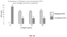 The amount of released and intracellular DOX in DOX-loaded platelets when stimulated with varying amounts of collagen are shown inFIG.10. The effect of varying amounts of collagen on inducing drug release on DOX-loaded platelet, as measured by light excitation and emission, is shown inFIG.10 in comparison with a control group containing no collagen.
