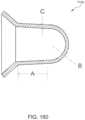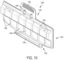 FIG.245 shows abaffle6460 which illustrates a number of the above features. As shown, thebaffle6460 is generally planar. Thebaffle6460 includesfirst regions6462 which are of a substantially uniform cross sectional shape. A recessed,second region6464 is also included and has a variable cross sectional shape. Other embodiments may not include a continuously varying cross section, but rather a cross section that changes in stepwise fashion over one or more steps. Though as shown, any cross section within thesecond region6464 would have a foot print smaller than that of thefirst regions6462, baffles6460 may include bulged regions as well. Multiple recessed and bulged regions may be included depending on the embodiment.