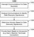 As part of1304, the communications may also be utilized to improve the model, dynamically update the signature, improve the domain specific knowledge and/or enhance other mechanism(s) employed for analysis. This dynamic nature of the signatures, domain specific knowledge, model and/or detection techniques reduces the occurrence of false positives and generally improves detection of intruders. For example, communications from user(s) made in the course of authorized utilization of the data sources are intercepted at1302 and analyzed at1304. When such communications are determined not to correspond to the intruder detection signature, the communications may be provided to the model as further examples of authorized use. Communications that are incorrectly determined to correspond to the intruder detection signature may be discovered upon further operation of the system. Consequently, the model is also updated to reduce the probability that a similar communication will result in an identification of the intruder detection signature. A feedback loop may also be utilized to allow an administrator or other authorized entity for the system to confirm or identify communications that were incorrectly identified as intrusions. Similarly, communications that are attempts by attacker(s) to exfiltrate data and which correspond to the data discover signature are provided to the model to reinforce the detection of such intrusions. The results of the statistical analysis described above may also be updated, for example to determine changes in patterns of communications. These changes in the patterns of behavior may themselves be correlated to intruder detection signatures and/or be utilized to update the intruder detection signature. Similarly, communications can be added to the domain specific knowledge that indicates authorized user behavior or the lack thereof. Thus, communications are utilized not only for intrusion detection but also dynamically updating information regarding what type of communications constitutes an intrusion. Consequently, the mechanisms for using the communications to identify one or more intruder detection signatures is dynamically updated.