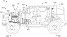 According to various embodiments, theengine610 is individually, theIMG700 is individually, or both theengine610 and theIMG700 are cooperatively configured to provide power to thetransmission620 to drive thetransmission620 and, thereby, drive thetransaxle drive shaft630, thetransaxle640, therear axle assembly500, the frontaxle drive shaft650, and thefront axle assembly500 to drive thevehicle10. According to various embodiments, theFEAD800 is configured to be selectively driven by theengine610, by the FEAD motor, by theIMG700, and/or electrically-operated. According to an exemplary embodiment, theESS1000 is configured to power various high-voltage components and low-voltage components of the vehicle10 (e.g., theIMG700, the FEAD motor, electrified FEAD accessories, cab displays, cab gauges, cab lights, external lights, etc.). According to various embodiments, except for electrical wiring, the components of the ESS1000 (e.g., battery packs, inverters, power distribution components, power conversion hardware, etc.) are variously positioned about the vehicle10 (e.g., within therear module400, under thepassenger capsule200, etc.), except proximate theengine610 or within thetunnel slot208 of thestructural tunnel206. Such positioning facilitates maintaining the components of theESS1000 at proper operating temperatures and away from high temperature zones proximate theengine610 and/or within thetunnel slot208 of thestructural tunnel206. In some embodiments (e.g., when theFEAD800 includes the FEAD motor, when theengine610 drives the FEAD, etc.), the FEAD motor and theIMG700 are configured to selectively operate as generators to facilitate charging theESS1000 using power provided by theengine610 while thevehicle10 is stationary or moving.