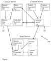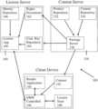 The license server (160) interaction starts when the client device (140) user attempts to access (320) the DRM restricted content (142) file typically using some type of rendering software (144). When the rendering software (144) accesses the file header information, it detects that the content (142) file is DRM restricted and then delegates the access to a resident DRM controller (146) plug-in.