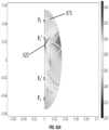 FIGS.87A and87B shows the spatial distribution and the time delay between the primary shock waves front (passing through F2 with no spike in pressure), secondary shock waves front (almost a straight line starting to interfere with the reflector's right top rim wave shown inFIGS.86A and86B) and the tertiaryshock waves front875.