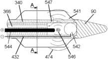 Based on this theory, theapplicator675 may be a special designedapplicator holder740, as presented inFIGS.74A and74B. From this figure it can be seen that a>b with the longitudinal movement of the assembly along the “a” dimension shown by the black arrow.