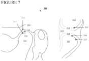 FIG.7 illustrates two (2) of a temporomandibular joint (TMJ), including a Sagittal CT view302 and a view of a Coronal ultrasound section304. Numbered elements and data points in views302 and304 correlate with each other. Elements shown in each view302 and304 include amandibular condyle311, atemporal bone312, anarticular disk313 and ajoint capsule314. Correlated data points, which includedata points315,316 and317, provide positioning information so that aspace318 in 3D CT302 may be fused with ultrasound data304, positioning sensor156 (FIG.4) and other accessory data.