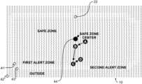 As aforementioned, there will preferably be multiple zones in the assisted guidance region. For exemplary and non-limiting purposes, in preferred embodiment wireless location assistedzone guidance system100 these are illustrated inFIGS.1 and2 as the “safe”, “first alert”, “second alert”, and “out-of-bounds” or “outside” zones, though there may be more or fewer zones, and alternative titles may be used to provide better description for a particular intended application of preferred embodiment wireless location assistedzone guidance system100. Each of these zones may be used to initiate a particular action, sequence, or lack thereof.