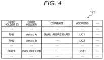In one example, in the example illustrated inFIG.4, the right holder ID “RH1” indicates that the right holder (right holder RH1) is called “Artist A”. The means of contacting the right holder RH1 indicates email address AD1. In addition, the right holder RH1 indicates that the address is “LC1”.