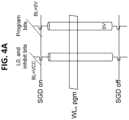 FIG.4A illustrates an example set of pillars in anexample memory array450 including memory cells to be programmed using an ISPP programming algorithm. As shown inFIG.4A, pillar potential on a memory cell being programmed is fixed at 0V by conducting the memory cell with the bitline through the select-gate-drain (SGD). In contrast, the level 0 (L0) memory cells and memory cells being inhibited (i.e., inhibit bits) have a floating pillar by increasing the associated bitline voltage to an inhibit voltage level. According to the ISPP programming algorithm, the respective programming levels are programmed sequentially from L1 to L7. For each memory cell being programmed, the application of the incrementally increasing programming pulse to the associated wordline causes the threshold voltage of each memory cell to increase until the memory cell reaches a target voltage level associated with the target programming level.