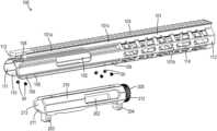 Theouter member101 may be designed as a single component to combine features that are typically part of the upper receiver and features that are typically part of the handguard in conventional firearms. As shown inFIGS.1-3C, theouter member101 may include anaft portion101aand aforward portion101b. Theaft portion101amay include features typically associated with the upper receiver of a conventional firearm including, for example, anejection port102, anupper rail103, and anopening113 for a charging handle. Theforward portion101bmay include features typically associated with a handguard of a conventional firearm including, for example, anupper rail103 and an array ofopenings114. The array ofopenings114 may be for aesthetic purposes, for facilitating cooling of the barrel and related components, and/or for other appropriate purposes. In some embodiments, an advantage of theouter member101 is thatupper rail103 is a single constant feature along its full length, which is different from conventional firearms which include a portion of a rail on the upper receiver and a separate portion on the handguard. Theupper rail103 may be a Picatinny rail (MIL-STD-1913 rail or STANAG 2324 rail), a Weaver rail, or any other appropriate rail. Although the length of theforward portion101bis shown as similar to theaft portion101a, theforward portion101bmay be shorter or longer than theaft portion101a. For example, in some cases, theforward portion101bmay be designed to extend approximately to the end of the barrel where the barrel can be any length from approximately 1″ to 24″ (2.54 cm to 60.96 cm) or any other appropriate length. In some cases, theouter member101 is configured such that thefront end112 is located before an end of the barrel such that the barrel extends beyond theouter member101 and a portion of the barrel is exposed. In other cases, theouter member101 is configured such that thefront end112 is beyond an end of the barrel such that the barrel and at least a portion of a muzzle device (muzzle brake, compensator, flash hider, suppressor, etc.) is covered by theouter member101.