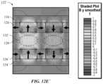 FIG.12C is an illustrative two-dimensional flux density plot in a y-direction for the model ofFIG.12A having a standard magnet array with two rotors having magnetic support plates.FIG.12C′ is an enlarged portion of the two-dimensional flux density plot ofFIG.12C. The arrows show the magnetic flux directions in the magnets. The arrows are axial only. In the standard array model, the flux from adjacent magnets is returned within the magnetic support plates (“back-iron”) to turn the flux, because the magnets themselves lack the capability by being only axially oriented North and South poles. The flux density in theairgap120 is indicated in the spacing of the lines. The circledarea130 inFIG.12C′ shows a representative width of high flux density.