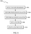 Instep502,optimizer124 identifies redundancy among a set of features. The set of features may be previously generated infeature pipeline builder116, executed infeature executor118, and executed inmodel executor120.Optimizer124 may remove the identified redundancy among the set of features. Instep504,optimizer124 performs a predecessor evaluation.Optimizer124 may recognize a feature in the set of features being executed and may analyze an impact of making an upstream feature configuration change relating to the feature. For example,optimizer124 may recognize features that have been used and executed.Optimizer124 may analyze upstream or backward impact, e.g., if to make feature configuration changes. Instep506,optimizer124 performs a successor evaluation.Optimizer124 may recognize the feature in the set of features being executed and may analyze an impact of making a downstream feature configuration change relating to the feature. For example,optimizer124 may analyze downstream or forward impact, e.g., if to make feature configuration changes. Instep508,optimizer124 rates a feature against a goal including overall execution time and overall execution footprint. For example,optimizer124 may rate the feature based on the overall execution time and overall execution footprint infeature pipeline builder116, executed infeature executor118, and executed inmodel executor120. Instep510,optimizer124 updates a feature state.optimizer124 may update a state of the feature based on the predecessor evaluation, the successor evaluation, and the feature rating. For example, a feature state may indicate a feature is active or inactive.Optimizer124 may update the state of the feature accordingly.