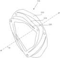 FIG.3 is a perspective view of an element coupling115 (e.g., a leaf spring unit) according to one embodiment. Theelement coupling115 ofFIG.3 includes aninner element region220 that is fixed to theinner element120 and anouter element region210 that is fixed to theouter element110. Theinner element region220 may be an inner mounting ring and theouter element region220 may be an outer mounting ring. Theinner element region220 andouter element region210 are connected by three flexures215 (e.g., leaf spring elements). In other embodiments, theelement coupling115 may have more orfewer flexures215.