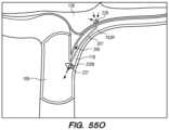 As an alternative method of confirming access toCP angle cistern138, the clinician can aspirate CSF through the penetratingelement3350 andsecond lumen3305 ofdelivery catheter3304 to confirm that the penetratingelement3350 passed throughIPS wall114 andarachnoid layer115 to access CSF within CP angle cistern138 (e.g., aspirated CSF denoted by arrow-head lines inFIG.55J). The clinician can use a syringe on the distal portion of handle (e.g., 10 cc syringe) to aspirate CSF proximally, throughdelivery catheter3304. The presence of clear CSF in the syringe can confirm a successful penetration through the IPS into theCP angle cistern138. If the clinician observes blood in the syringe, this can indicate that the penetratingelement3350 did not completely pass throughIPS wall114 or remained entirely withinright IPS102R. If the clinician did not penetrateIPS wall114, the clinician can re-attempt to penetrateIPS wall114 at the target site, attempt to penetrateIPS wall114 at another target penetration site along the firstcurved portion102A ofright IPS102R, attempt to penetrateIPS wall114 along the secondcurved portion102B ofright IPS102R as will be further described below, or abort the procedure.