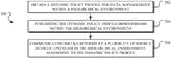 Referring toFIG.6,example operations600 for data management within a hierarchical environment are illustrated. In one implementation, anoperation602 receives a dynamic policy profile at a level from upstream in a hierarchical environment. The dynamic policy profile may be generated by a policy profile manager deployed in the hierarchical environment that is configured to manage end-to-end data transfer within the hierarchical environment. In one implementation, the dynamic policy profile is published downstream from the policy profile manager in the hierarchical environment. The dynamic policy profile may include an action and a priority level. Anoperation604 deploys the dynamic policy profile at the level, and anoperation606 dynamically adjusts data management at the level by executing the action according to the priority level.