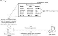 In some implementations, as shown byreference number106, the document analysis device may analyze records (e.g., transaction records) associated with the account to identify records associated with a document and/or associated with a series of recurring events. For example, the account may be associated with a ledger (e.g., a transaction ledger) or a log that includes records associated with the account. The records may include information associated with different events associated with the account. “Events” may include transactions, payments, charges, scheduled events, and/or other account events associated with the account. For example, as shown inFIG.1A, the ledger may include an indication of a set of transactions associated with the account. The records may indicate metadata associated with the transactions. For example, the metadata indicated by the records may be information provided by a transaction terminal or a transaction backend device (not shown inFIG.1A) associated with the transaction, such as a time (or date) of the transaction, a location of the transaction, an amount of the transaction, and/or an entity (e.g., a merchant and/or vendor) associated with the transaction, among other examples. For example, as shown inFIG.1A, a first record may indicate that a transaction is associated with “Entity A” (e.g., the entity associated with the transaction), a date of “04/03/2020” (e.g., a date associated with the transaction), and an amount of “$50” (e.g., an amount of the transaction). A second record may indicate that a transaction is associated with “Vendor B” (e.g., the entity associated with the transaction), a date of “04/06/2020” (e.g., a date associated with the transaction), and an amount of “$27” (e.g., an amount of the transaction).