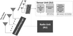 RegardingFIG.81, the sensor unit has three (3) major subfunctions: RF capture (I&Q), RF environment analysis (channelizer, detection, classification, identification, geolocation, and associated ML algorithm to get RF awareness), and customer programable and data analysis (customer actionable data). The present invention provides for several options for interfaces with the RAN, including all RF capture being split between RU and DU (depending on the split option used); RF environment analysis being split between DU and CU (depending on the split, and some basic data analysis (only for channel interference) will be in the CU); noting that most of the customer inputs for programmable and data analysis functions are operable in the MEC and core.
