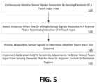 According to examples, thecontrol module120 continuously monitors sensor signals301 generated by sensing elements of the sensing layer210 (510). Thecontrol module120 can further detect instances when one ormultiple sensor signals301 modulate in a manner that is potentially indicative of a touch-input (520). For example, thecontrol module120 can detect when the modulating sensor signal(s)301 exceed a corresponding baseline value by an amount which exceeds the touch trigger threshold.