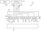 InFIG.3, a side view illustrates details of a mass-transfer apparatus300 according to an example embodiment. The apparatus includes atransfer substrate302 with two ormore transfer elements304. Each of thetransfer elements304 includes anadhesion element306 having a first surface adhesion at a first temperature and a second surface adhesion at a second temperature. The second surface adhesion is less than the first surface adhesion. Each of thetransfer elements304 also includes athermal element308 operable to change a temperature of theadhesion element306 in response to an input, e.g., viainputs310. Acontroller312 is coupled to provide theinputs310 to thethermal elements308, thereby causing a subset of thetransfer elements304 to selectably pick up and holdobjects314 to and (optionally) release theobjects314 from thetransfer substrate302. In particular, theobjects314 will not stick to thetransfer elements304 at the second surface adhesion but will stick at the first surface adhesion.