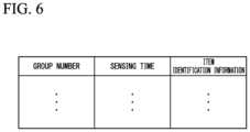 FIG.6 is an explanatory diagram showing an exemplary data structure of information in which a sensing time and item identification information stored in thestorage unit280 are associated with each other (association information which will be described later). As shown inFIG.6, thestorage unit280 stores a group number, a sensing time, and item identification information in association with each other.