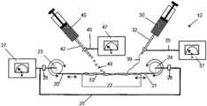 Thesyringes30 and40 depicted, e.g., inFIG.1 are used to deliver polymer (first syringe30) and, optionally another liquid (second syringe40).Second syringe40 can be used to deliver a polymer composition different from the polymer of thefirst syringe30. The nozzles are depicted in a specific orientation relating to the electrodes, but in practice can be placed in any suitable spatial location such as normal to the deposition axis extending between the two electrodes, and typically in an optimized spatial location. Although syringes, such as medical syringes, are depicted, any reservoir, nozzle, and fluid pumping apparatus can be employed, including peristaltic pumps, medical syringes, gravity-feed systems, etc. as are broadly-known. Likewise, nozzles can be any suitable size and shape conductor, including, without limitation, standard medical hypodermic needles, or metal tubes. Deposition and control of the rate of deposition of the polymer or other liquid can be manual, though for reproducibility and uniformity, deposition control is automated. For example, in one aspect, deposition is controlled by syringe pumps, such as programmable syringe pumps, as are broadly-known in the laboratory and medical arts. Control of deposition can be programmed into the syringe pump, or can be controlled by a separate computing unit or controller, such as a personal computer, workstation, smartphone, etc. Syringe and syringe pumps are one method of delivering controlled amounts of polymer and, where applicable, other liquids, in the described system. In another aspect, referring to thesystem10 depicted inFIG.1, rather thansyringes30 and40, a peristaltic pump, or an infusion pump, is used to control delivery of the polymer and, where applicable, other liquids. Choice of an appropriate delivery mechanism for the polymer and, where applicable, other liquid(s), is well-within the abilities of a person of ordinary skill in the engineering arts. Further, additional sources of other polymers, or other constituents, such as ECM material, useful in preparation of a fiber matrix, may be added, and electrodeposited under suitable conditions.