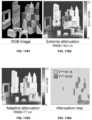 FIG.11B1 shows an example of a scene with a wide range of illumination levels, albedo variations, and multiple objects over a relatively wide depth range that was imaged using a SPAD-based pulsed LiDAR system with different attenuation factors in the presence of ambient light having an intensity that varies over the scene illuminated by a light source having moderate intensity (e.g., roughly 15,000 lux), including an attenuation factor (“adaptive attenuation”) determined on a per-location basis in accordance with some embodiments of the disclosed subject matter and selected from a discrete number of attenuation levels (in this case two discrete values).