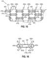 FIG.15 depicts a top plan view of a portion of another exemplary staple cartridge for use with the end effector ofFIG.3, showing a plurality of suture strands strung laterally across a deck of the staple cartridge over staple openings of the staple cartridge for guiding respective staple legs during deployment of staples out of the staple openings;