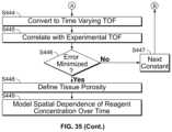 FIG.35 shows an embodiment of the disclosed method for obtaining a diffusivity coefficient, a porosity, and formaldehyde concentration at the tissue sample center. At S430 the acoustic velocity of the sample is measured as was previously described in the context ofFIG.3. Also like the embodiment ofFIG.3, operations and decisions S431, S432, S433, S434, S435, S436, S437 and S438 are performed to define the diffusivity constant. Once the diffusivity constant is determined at S439, a range of porosities that are used to model the diffusion of the reagent solution into the sample is set at S440. The range can be set by default or entered by a user. For example, based on the experimentally determined porosity values discussed above in regard toFIG.22, to a range of 0.05 to 0.50 (or a narrower) should cover most, if not all, tissue types. A narrower range can be set when the tissue type has been examined prior, and for example, the user can enter the tissue type to provide an appropriate range of values for the model to explore. At S441, S442 and S443, the diffusivity constant from S439 and a candidate porosity set at S440, are used to model the spatial dependence of the reagent over a series of time points T to T+n. The model built over the series of time points is then used to generate an expected TOF curve at S444 and correlated with the experimental TOF curve at S445. At S446, the error between the expected and experimental TOF curves is checked to see if it is at a minimum, and if so, the candidate tissue porosity is determined at S448 to be the actual tissue porosity. If not, the process is repeated with a second candidate porosity at S447. Once both the diffusivity constant (S439) and the porosity (S448) are defined, a spatial model of reagent concentration across time can be generated at S449. Once the spatial model of reagent concentration over time is established, the concentration at a particular point within the sample at a particular time, such as at sample center, can be extracted from the model.