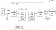 The trustedentity130 may also be tasked with configuring the tag policies125. In one embodiment, only the trustedentity130 can configure and change the tag policies125. This prevents a nefarious actor from changing the security and performance isolation established by the tag policies125. Moreover, whileFIG.1 illustrates the trustedentity130 as part of theDPU110, in other embodiments, the trustedentity130 may be external to theDPU110 but have a verified communication path to theDPU110 in order to perform the functions described above.