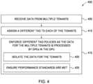 Block415 can include two sub-blocks to prevent nosy and noisy neighbors. Atblock420, the DPEs isolate the data for the tenants. That is, when processing data for Tenant A, the tag policy may prevent the DPE from accessing data for another tenant. Or the tag policy may indicate that Tenant A can access the data for Tenant B but not for Tenant C.