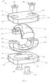 In some examples, theinterior articulating surface144 of the firstu-shaped element255 is configured to connect with theinterior articulating surface282 of the secondu-shaped element280. In an illustrative example, theinterior articulating surface244 of the firstu-shaped element255 is configured to articulate against theinterior articulating surface282 of the secondu-shaped element280. In various embodiments, theu-shaped element255 of thefirst base225 and theu-shaped element280 of thesecond base235 interlock with one another, preventing the two components from separating.