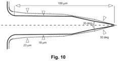 - b) a tip having a width of about 0.5 μm to about 2 μm.
