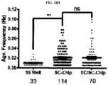 Example 14In a controlled study, calcium influx live cell imaging was performed on diMNs that had been cultured in the chip (MN Chip) and in co-culture with BMECs (MN/BMEC). Neuron calcium influx was recorded as described previously, and plotted with respect to time (FIG.27A-D, right panels). Calcium influx events or peaks correspond to neural activity and were counted by both automated software and blinded human technician. Each event was assigned a time-stamped value and depicted for each tracked neuron with respect to time.