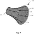 FIG.6 shows the embolicmaterial blocking catheter100 with the embolicmaterial blocking element108 fully deployed. The deployed configuration and position of the embolicmaterial blocking element108 illustrated inFIG.6 is accomplished by proximally retracting the embolicmaterial blocking catheter100 to deform the embolicmaterial blocking element108 from the substantially disk-shaped configuration illustrated inFIG.4 into a substantially cone-shaped configuration such as illustrated inFIG.6. An inner circumferential edge of the embolicmaterial blocking element108 is attached to themain tube104 near or at the end of themain tube104. The embolicmaterial blocking element108 can be sized to have a deployed outer diameter suitable for deployment in theaorta118 between the nativeaortic valve126 and thesinotubular junction128 and slightly greater than an applicable inner diameter of theaorta118 downstream of thesinotubular junction128. As a result, the outer circumferential edge of the embolicmaterial blocking element108 is restrained from moving proximally by the inner surface of the aorta188 downstream of thesinotubular junction128 so that relative proximal movement of themain tube104 deforms the embolicmaterial blocking element108 into the substantially cone-shaped configuration illustrated inFIG.6 andFIG.7. The cone-shaped membrane of the embolicmaterial blocking element108 serves to guide captured embolic material inward toward thelumen112 of the embolicmaterial blocking catheter100.