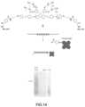 The crude conjugate mixture was fractionated on aSuperdex 200 size exclusion column, while fractions were monitored by UV absorbance (FIG.36, top). To validate the method, fractions were analyzed by agarose gel electrophoresis. As described above, this method of electrophoresis made it possible to visualize the degree to which avidin was attached to polymer, and in this case to analyze the composition of each fraction from the column. Selected fractions were incubated with biotinyl-fluorescein (1 molar equivalent relative to avidin) prior to gel loading, with biotinyl-fluorescein loaded separately as a marker (leftmost lane,FIG.36, bottom). Electrophoresis was performed in 0.8% agarose gels, poured and run in a buffer of 10 mM Sodium Borate, pH 11. The gel was visualized by 532 nm excitation. Retardation of fluorescein-visualized bands for fractions C2-C6 indicates purified polymer-avidin conjugate, while the two bands observed for fraction C8 indicate a mixture of polymer-avidin conjugate and free avidin. Fractions C10-D2 show only free avidin.