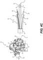 Device24 may also be rotated about axis A in a direction indicated by arrow F inFIG.4C.FIG.4C illustratessecond portion54 extending away from first portion52 (extending out of the page inFIG.4C), as will be described herein. Rotation ofdevice24 about axis A in a clockwise direction, for example, may cause articulation wires to be pulled or pushed, and may causefirst portion52 to move from the neutral position (wherefirst portion52 lies along longitudinal axis C) in a direction right of the neutral axis, indicated by arrow E (e.g., in the down direction inFIG.4C and shown in dotted lines). Rotation ofdevice24 about axis A in an opposite direction (e.g., a counterclockwise direction) may cause articulation wires to be pulled or pushed, and may causefirst portion52 to move to the left (in an upwards direction inFIG.4C), toward the neutral position. Continued rotation ofdevice24 may causefirst portion52 to move left of the neutral position (above longitudinal axis C inFIG.4C), as illustrated by the solid lines offirst portion52 inFIG.4C.