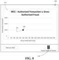 In the example shown inFIG.8, transaction data from the current increment is displayed in a first format. The first format is afirst shape820 and the size of thefirst shape820 is dependent on a data point corresponding to authorized transactions vs. gross authorized fraud for February 2022. Transaction data from one or more previous increments is displayed in a second format. In this example, the previous increment is January 2022 and as such the second format includes a dashed line that extends from a location of the previous first shape (first shape720) to the currentfirst shape820. In this example, the transaction data is displayed such that it appears as though a tail is displayed that tracks or otherwise follows the previous increment to the current increment.