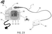 FIG.23 illustrates one embodiment of anapparatus1 in accordance with the present invention which has a controller, generally designated as10, which is pluggably connected to a distal sensor module, generally designated20, by a connector system, generally designated as40.Controller10 houses a light emitter system, generally designated as11, a light detection system, generally designated as12, and electronics, generally designated as13.Controller10 can include anauditory alarm14, communicate wirelessly15 or by awired connection16, and have aninformation interface system50 configured to output information, such as a calculated concentration of a targeted analyte in aliquid sample81 of ahuman body90. In addition to buttons, switches, or touch pad interface, a bedside ortable top controller10 can display the appropriate measurement information which may include, but not be limited to, glucose concentration (mg/dl, mmol/L) that may be interstitial fluid related or blood sugar related; heart rate; temperature, pulse oximetry, blood pressure and hydration level (e.g., scale of 1-10, percent of water compared to total body mass).Controller10 can also incorporate suitable alarms based on pre-set alarm levels, and alarm notifications may be conveyed audibly or by a wired or wireless communication reporting to a monitoring system or control point.