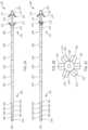 Referring now toFIGS.2B and2C, an alternative embodiment ofelectrode lead200 is described.Electrode lead200′ is constructed similarly to electrode lead200 ofFIG.2A, wherein like components are identified by like-primed reference numbers. Thus, for example,lead body202′ inFIGS.2B and2C corresponds to leadbody202 ofFIG.2A, etc. As will be observed by comparingFIGS.2B and2C withFIG.2A,electrode lead200′ includes fixation elements that are radially offset with respect to each other. For example,first fixation elements212′ may be configured to be radially offset relative tosecond fixation elements214′ by prefabricating at least one offirst fixation ring216′ andsecond fixation ring218′ relative to leadbody202′ such that at least one offirst fixation elements212′ andsecond fixation elements214′ is radially offset with respect to the other. For example, as illustrated inFIG.2C,first fixation elements212′ has threeprojections203 andsecond fixation elements214′ has threeprojections205 and, preferably,projections203 are radially offset relative toprojections205 by a predetermined angle, e.g., approximately 60 degrees. However, as appreciated by one of ordinary skill in the art,projections203 may be radially offset relative toprojections205 by other angles to achieve the benefits in accordance with the present invention described below.Projections203 and205 may be formed of a flexible material, e.g., a polymer, and may be collapsible and self-expandable when deployed. For example,projections203 and205 may collapse inward towardlead body202′ in a delivery state such thatprojections203 and205 are generally parallel to the longitudinal axis oflead body202′ within a sheath. In the delivery state, the radially offset first andsecond fixation elements212′ and214′ need not overlap within a sheath. Further,projections203 and205 may expand, e.g., due to retraction of the sheath, in a deployed state such thatprojections203 are angled distally relative to leadbody202′, and resist motion in the first direction and prevent, in the case illustrated, insertion of the lead too far, as well as migration distally, andprojections205 are angled proximally relative to leadbody202′ to resist motion in an opposite direction relative tofirst fixation elements212′. This combination prevents migration of the lead both proximally and distally, and also in rotation.