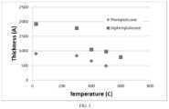The thermal stability of plasma-polymerized phenylsilicone and diphenylsilicone coating layers, as demonstrated by plotting the thickness of the coating layer vs. 10 minutes of processing in flowing nitrogen at the indicated temperature, is shown inFIG.3. FromFIG.3, it is seen that as processing temperatures move above 300° C., plasma-polymerized phenylsilicone and diphenylsilicone are not very thermally stable as deposited. Specifically, both materials exhibited significant film thickness loss upon ten minutes of heating in flowing nitrogen at temperatures above 300° C., particularly at 400° C. and above.