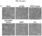 FIG.25A-E. Viability assay of cells cultured on surfaces coated with the immobilized BDNF peptide. (a) Schematic showing BDNF Peptide and PEG6-BDNF Peptide functionalized glass coverslips. (b) Confocal micrographs of glass coverslips coated with APTES, immobilized BDNF and PEG6-BDNF peptides. FITC conjugated BDNF Peptide and PEG6-BDNF Peptide are shown in green. (c) Bright field images of cells cultured on surfaces coated with APTES, the immobilized BDNF peptide, the immobilized PEG6-BDNF peptide, and control poly-d-lysine (PDL) for 5 days in vitro. (d) Confocal micrographs of neuronal cells stained with calcein (live marker, green) and propidium iodide (dead marker, red) cultured on the coatings referred in (c). (e) Quantification of cell survival under conditions shown in (d). (values normalized to total number of cells).