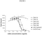 DESCRIPTION OF THE FIGURESFIG.1 shows a graphical representation showing an assay for ability of TNV mAbs in hybridoma cell supernatants to inhibit TNFα binding to recombinant TNF receptor. Varying amounts of hybridoma cell supernatants containing known amounts of TNV mAb were preincubated with a fixed concentration (5 ng/ml) of125I-labeled TNFα. The mixture was transferred to 96-well Optiplates that had been previously coated with p55-sf2, a recombinant TNF receptor/IgG fusion protein. The amount of TNFα that bound to the p55 receptor in the presence of the mAbs was determined after washing away the unbound material and counting using a gamma counter. Although eight TNV mAb samples were tested in these experiments, for simplicity three of the mAbs that were shown by DNA sequence analyses to be identical to one of the other TNV mAbs (see Section 5.2.2) are not shown here. Each sample was tested in duplicate. The results shown are representative of two independent experiments.