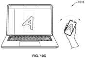In the illustrated example1025 ofFIG.10E, content (e.g., the letter “A”) is shared from a remote device (e.g., a smartphone) to a host device (e.g., a laptop). As the remote device is interacted with (e.g., moved closer to the user and/or further from the host device), the edit to the content is applied at the host device. In the illustrated example ofFIG.10D, the letter A is enlarged as the user moves the remote device further from the host device.