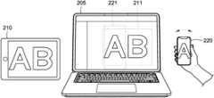 In some examples, multiple remote devices may be used.FIG.2 illustrates an example in which multipleremote devices210,220 are used to display a user interface from ahost device205. As illustrated inFIG.2, a firstremote device210 displays a first region ofinterest211, while a secondremote device220 displays a second region ofinterest221. In the illustrated example ofFIG.2, the regions ofinterest211,221 partially overlap. However, such regions ofinterest211,221 are independent of each other and need not have any overlap. Thus, in some examples, the region ofinterest211 for the firstremote device210 may be selected as an image being edited (e.g., within an image editor software, while the secondremote device220 may show a menu and/or tool pallet within the image editor software.)