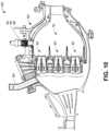 FIG.8 is an example quarter wavetube combustion section800 which can be implemented on the examplegas turbine engine100 ofFIG.1. The example quarter wavetube combustion section800 includes a plurality ofcombustion portions802 dispersed circumferentially around the quarter wavetube combustion section800. In operation,quarter wave tubes804 extend from thecombustion portions802 to dissipate vibrational frequencies generated through the ignition of fuel. Thequarter wave tubes804 are sized and shaped according to anticipated frequency ranges experienced in thegas turbine engine100. In operation, thequarter wave tubes804 are tuned for a small range of frequencies (e.g., 100 Hz to 500 Hz).