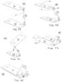 As is known in the art, electronic components of the type previously mentioned, and others, often include feet for the purpose of providing a space beneath the component. The feet may aid in providing air circulation to the component to prevent overheating or for other reasons. Some CDJs and laptop computers, for example, have feet or nubs that provide a gap of about one-quarter inch; some mixing tables and drum machines, for example, have feet or nubs that provide a gap beneath the component of about one-half inch. Thus, in this embodiment, thebase105 preferably has a height of less than about one-half inch, e.g., ⅛″.