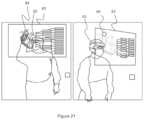 As noted above and shown inFIG.21, the system may be in communication with one or more second systems such that one or moreremote users62 can view thesame images63 from the system on the one or more second systems and communicate will the user and other remote users and together focus on a common area ofinterest64. The AR headset can be worn at the surgery site or remotely providing multiple parties with a real-time experience of the surgery to all headset wearers. By utilizing gesturing recognition and other mentioned technologies embedded in all user's headsets, any number of wired or wireless connected, or networked users may see the same virtual image. Then, any connected user can point to a specific point or set of points, or define one or more areas in virtual space, on the commonly seen virtual image in all the user's AXR headsets, which may then communicate and correspond that same reference information into the view of a select set or all other user's AXR headsets or to any other monitors and displays in the network. This technique may work with either a current simultaneous view or a current or past picture or video feed. Since the controller on all connected and simultaneously viewing headsets knows exactly where each pixel exists in the displayed virtual image, it may be able to identify the specific point or set of points, or area or areas, of interest and transmit that information wirelessly, or over a wired connection, to create a corresponding marker on all connected user's headsets so that all connected users can see and understand the specific point, set of points, area, or areas of interest originated by the initial pointing user. Likewise, the point or set of points or area or areas commonly displayed may be used as a point of reference or a measurement. In addition to images, any textual, graphical, or other information may also be commonly viewed by connected users. In addition, any connected AXR headset user using the technologies mentioned herein or through AI techniques may choose to view commonly displayed 2D or 3D images or 2D or 3D models in the same perspective as another; or any user may choose a different perspective of the same 2D or 3D images or models.